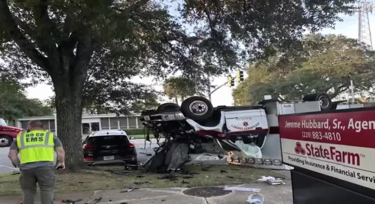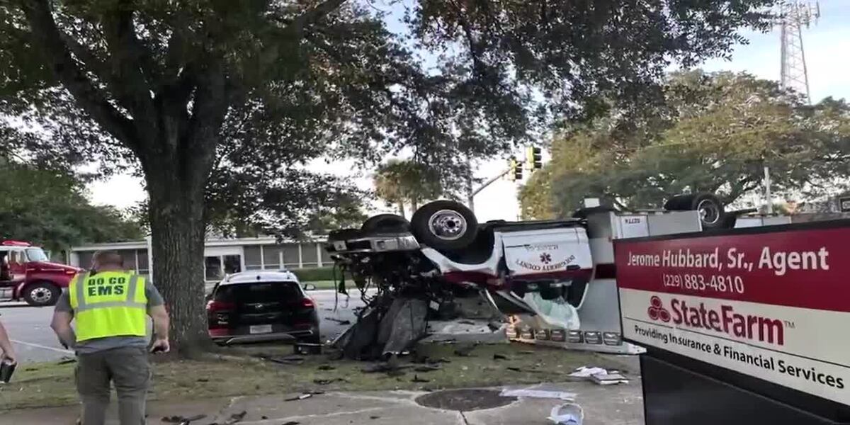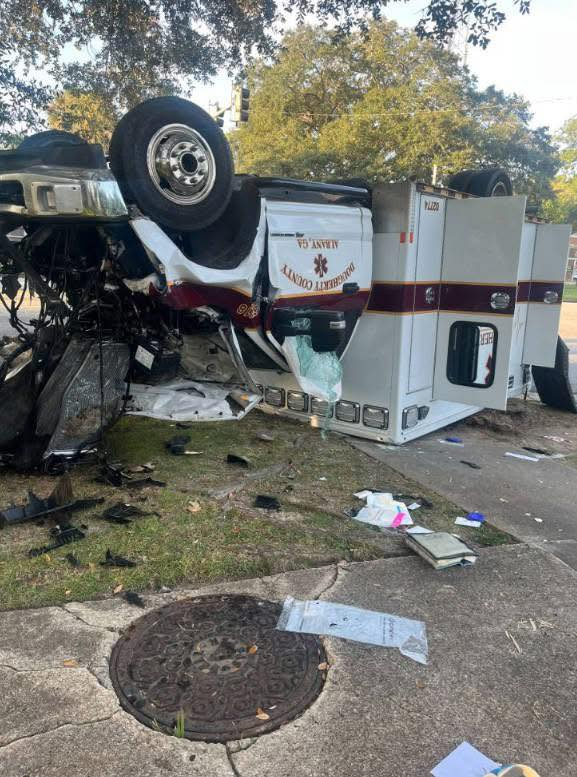 Dougherty County EMS ambulance rolled over from the impact. Witnesses described the moment as shocking, with sirens from other emergency units arriving almost instantly to provide help.