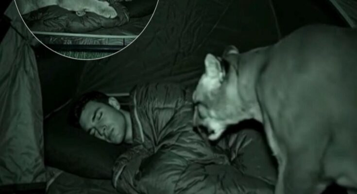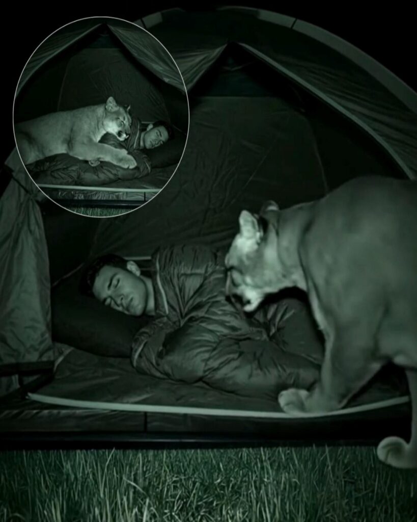 The mountain lion circled once, twice, then lowered itself to the ground. Not in attack, not in ambush, but in rest. It curled its massive body against the side of the tent, its flank pressed to the fabric, its breathing deep and steady. For hours, it remained there, rising and falling in rhythm with the man sleeping just inches away.