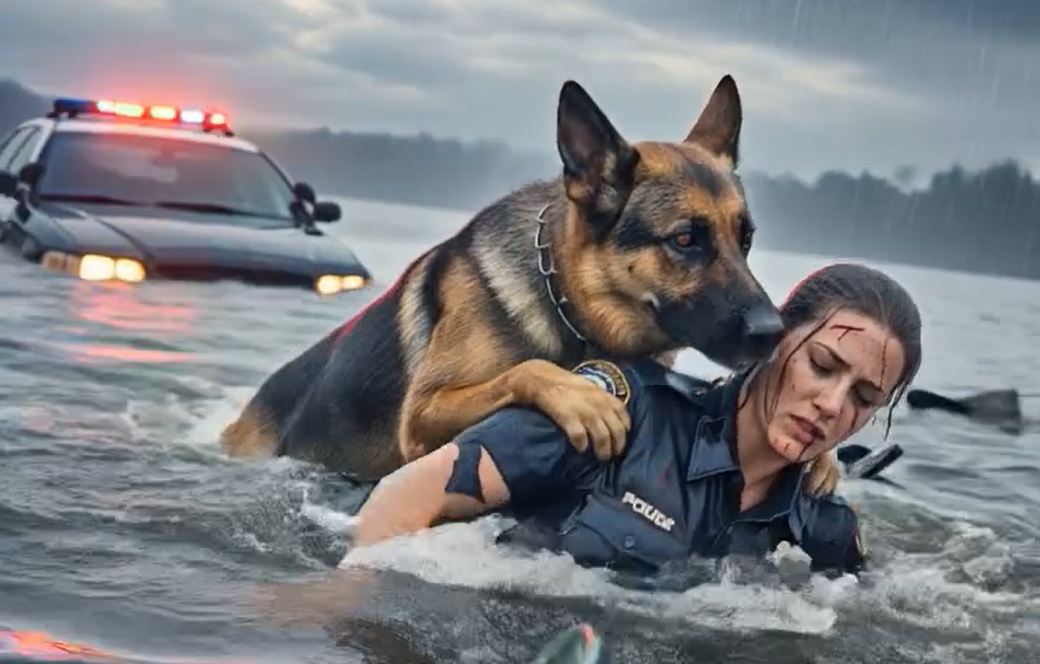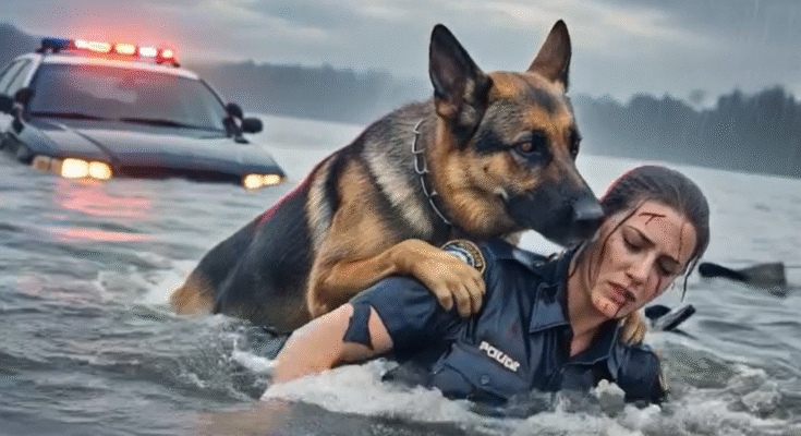 When a police patrol car plunged into the river, chaos unfolded in seconds — but an aging German Shepherd leapt into the icy water, dragging a young officer back to safety just in time. What no one expected was what she whispered, breathless, after the rescue — words that stunned investigators and turned the entire case upside down. In that chilling moment, the loyal K9 was no longer just a hero, but the sole living witness to a crime authorities believed would remain buried forever. What secret could a dog’s courage possibly bring to light?